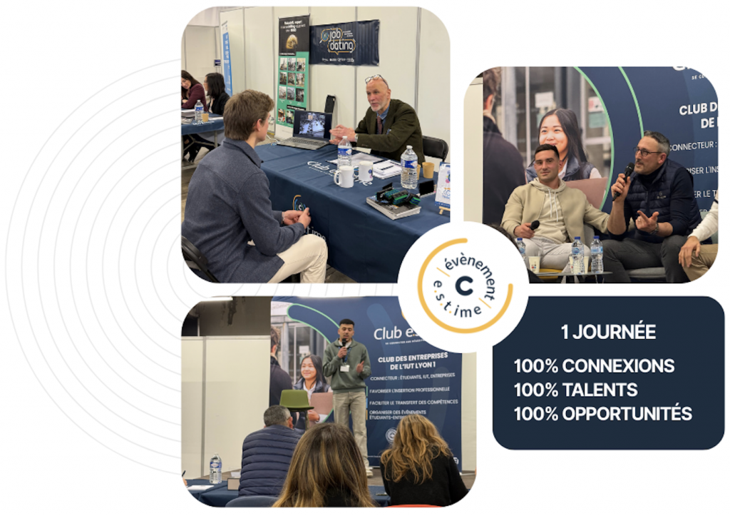 Le Job Dating 360°, organisé par le Club e.s.t.ime et l’IUT Lyon 1, est un événement de recrutement phare qui réunit étudiants, entreprises et institutions dans un cadre dynamique et professionnel.